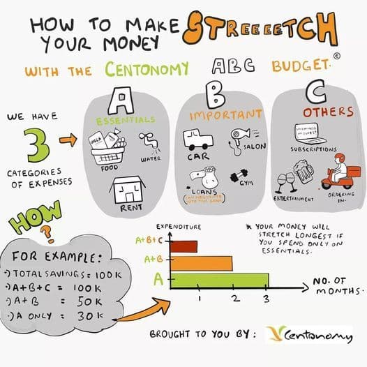 ⭐ A - Essential expenses for survival. You can't do without them e.g. food ⭐ B - These expenses are important, but if push comes to shove, you can find an alternative or do without it. ⭐ C: Expenses that bring enjoyment to your life but you have the option of cutting them out without your life significantly falling apart. Cut what you can from the B's and C's to stretch your money. This will give you time as you figure out your next steps, especially if your income has been affected.