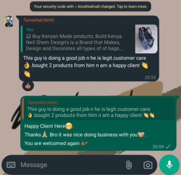 Happy Client π Customer satisfaction is at the heart of everything we do. We are committed to providing exceptional customer service, ensuring that your experience with Neil Shem Design's is as seamless and enjoyable as possible. From the moment you browse our website to the time you receive your order, we strive to exceed your expectations. Make Your Dream Bag With Us. Call/whatsup +254790591280 to talk to Us directly. We also Do Bulk Production for Resellers. We have everything for everyoneπ€πΌ.