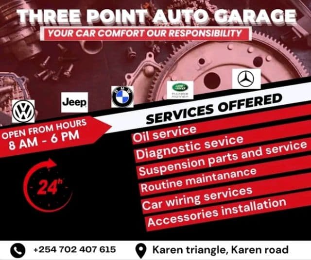 Welcome to Three Point Auto Garage, where excellence meets automotive care. Our seasoned team of professionals ensures your vehicle receives nothing short of exemplary service, backed by years of expertise and proficiency in the industry. Count on us for dependable maintenance and repairs, delivered with unwavering reliability and consistency. Equipped with cutting-edge diagnostic technology, we swiftly pinpoint and resolve any vehicle issues, ensuring minimal disruption to your daily routine. What sets us apart is our dedication to personalized service, catering to your individual needs and preferences with utmost attention to detail. Rest assured, your vehicle is in good hands with our state-of-the-art equipment, guaranteeing precision and quality in every repair. We believe in transparency, offering honest pricing that reflects the true value of our services. Experience prompt turnaround times, as we efficiently tackle repairs and maintenance tasks, minimizing downtime and getting you back on the road swiftly. From routine maintenance to complex repairs, we offer comprehensive solutions under one roof, making us your go-to destination for all automotive needs. Your satisfaction is our priority, backed by our unwavering commitment to ensuring your happiness with our services. Conveniently located Karen triangle, karen road, we're here to serve you with convenience and accessibility. Trust Three Point Auto-garage for a seamlessautomotive experience tailored to your needs. Call 0702407615 to book a sport today